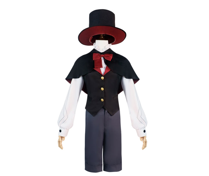 - Inspiration: Inspired by the child version of Linyne from Genshin Impact, this cosplay set captures his signature look, featuring a stylish black vest with red accents, a top hat, bow tie, and matching accessories.